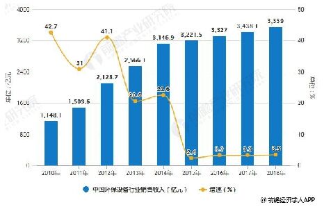 2010-2018年中國環(huán)保設備行業(yè)銷售收入統(tǒng)計及增長情況。數(shù)據來源:前瞻產業(yè)研究院整理