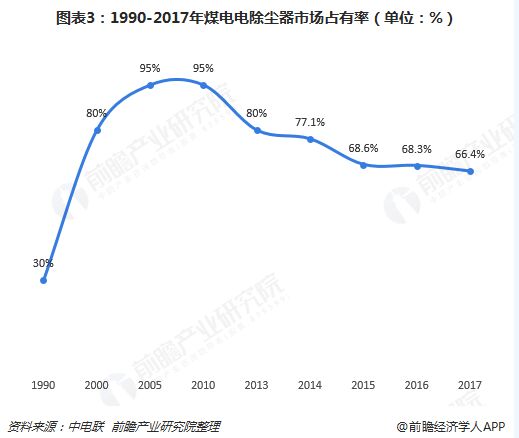 以燃煤電廠為例,近年來電除塵的技術(shù)創(chuàng)新,在煤電行業(yè)超低排放工作中取得了顯著的成績,有效地保障了機(jī)組長期穩(wěn)定運(yùn)行、持續(xù)超低排放運(yùn)行。燃煤電廠電除塵器應(yīng)用比例從1990年的30%發(fā)展到2000年的80%,2005-2010年間占比維持在95%,隨后袋式、電袋復(fù)合除塵技術(shù)興起,占比有所下降。據(jù)中電聯(lián)統(tǒng)計(jì),截至2017年12月,電除塵在電力行業(yè)除塵市場占有率約為66.4%,電除塵器依然是燃煤電廠的主流除塵設(shè)備,低低溫電除塵技術(shù)幾乎成為國內(nèi)燃煤電廠超低排放的“標(biāo)配”。
