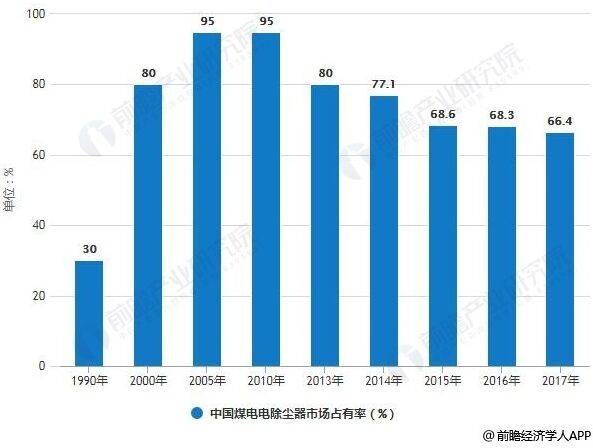 1990-2017年中國煤電電除塵器市場占有率統(tǒng)計情況