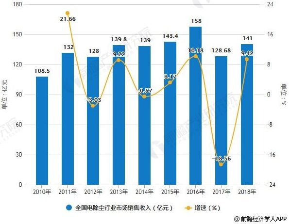 2018年全國電除塵行業(yè)市場規(guī)模統(tǒng)計分析 據(jù)前瞻產(chǎn)業(yè)研究院發(fā)布的《中國除塵設備制造行業(yè)產(chǎn)銷需求與投資預測分析報告》統(tǒng)計數(shù)據(jù)顯示,2010年全國電除塵行業(yè)市場銷售收入已達108.5億元。2012全國電除塵行業(yè)市場銷售收入有所下降,之后呈現(xiàn)逐年增長態(tài)勢。到了2016年全國電除塵行業(yè)市場銷售收入增長至一個高峰,達到158億元,同比增長10.18%。 不過,受電力行業(yè)電除塵市場需求出現(xiàn)回落,而非電行業(yè)電除塵市場有待逐步回升,同時部分電除塵企業(yè)風險意識不強、經(jīng)營管理出現(xiàn)了較大的問題,低價競爭等因素,電除塵行業(yè)市場規(guī)模有所收縮。據(jù)不完全統(tǒng)計,截止至2017年全國電除塵行業(yè)市場銷售收入下降至128.68億元,比2016年下降18.56%。 但隨著行業(yè)企業(yè)逐漸掌握了濕法除塵技術以及低低溫除塵技術上,靜電式除塵器技術的更新?lián)Q代也帶動了行業(yè)重新煥發(fā)生機,市場規(guī)模有望再次上揚,初步測算2018年全國電除塵行業(yè)市場銷售收入將達到141億元左右。