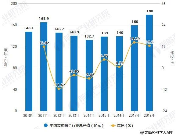 2010-2018年中國袋式除塵行業(yè)總產(chǎn)值統(tǒng)計及增長情況預測