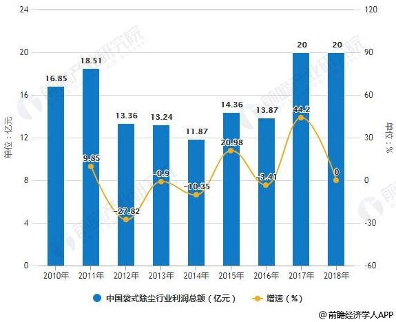2010-2018年中國袋式除塵行業(yè)利潤總額統(tǒng)計及增長情況預測