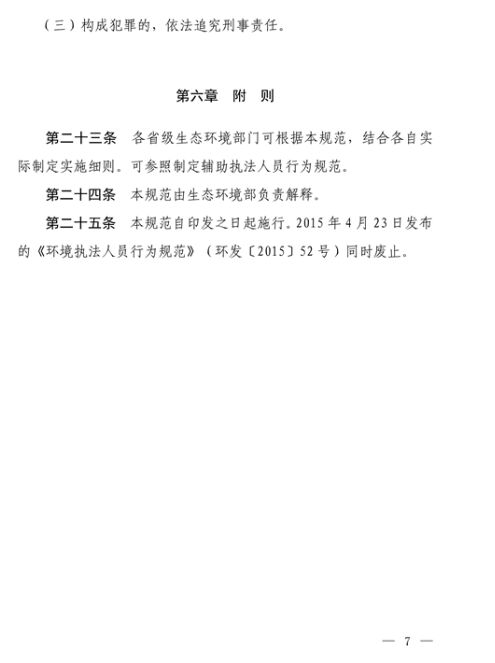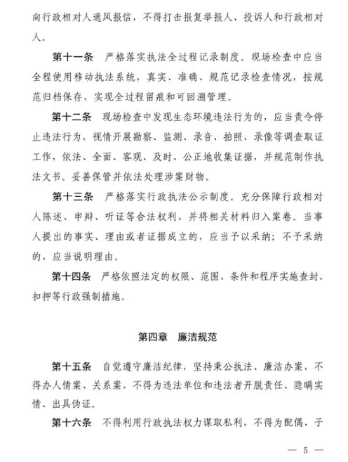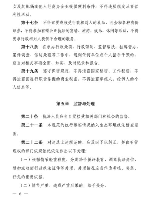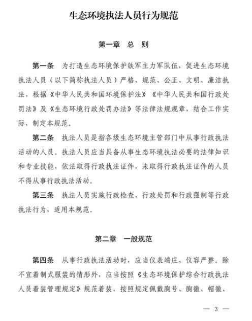 為進(jìn)一步加強(qiáng)生態(tài)環(huán)境執(zhí)法隊(duì)伍建設(shè),促進(jìn)嚴(yán)格、規(guī)范、公正、文明、廉潔執(zhí)法,根據(jù)《中華人民共和國(guó)環(huán)境保護(hù)法》《中華人民共和國(guó)行政處罰法》及《生態(tài)環(huán)境行政處罰辦法》等法律法規(guī)規(guī)章,結(jié)合執(zhí)法工作實(shí)際,我部修訂了《生態(tài)環(huán)境執(zhí)法人員行為規(guī)范》,并經(jīng)2023年第16次部常務(wù)會(huì)議審議通過,F(xiàn)印發(fā)給你們,請(qǐng)遵照?qǐng)?zhí)行。