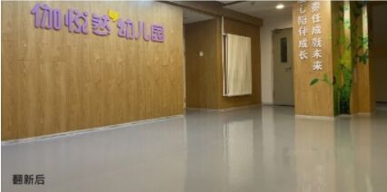 北京伽悅然是一家大型高端的兒童早期教育基地,該學校進門處有一塊大面積的走廊,每天學生、教師和家長會在這里進行多次活動和集會。由于高人流量的踩踏、日常污垢清潔和反復打磨拋光等,走廊的亞麻地板外觀變得陳舊,且地面有一定的磨損,師生日常行走存在安全隱患。因此園方考慮更換地板,經過一段時間的市場考察,幼兒園相關負責人決定嘗試Bona博納彈性地板養(yǎng)護方案。