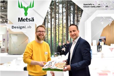 結(jié)構(gòu)包裝設(shè)計師 Iiro Numminen 與包裝服務(wù)總監(jiān)Ilkka Harju 在Interpack 的芬林紙板展臺上展示該超輕披薩盒方案