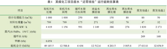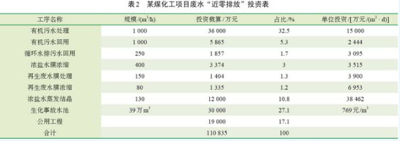 可采取的對策建議包括:(1)增加調(diào)節(jié)池容積,在調(diào)節(jié)池的停留時間不低于48 h ;(2)對于碎煤加壓氣化廢水,提高酚氨回收裝置的回收率及穩(wěn)定性;(3)建設(shè)大容積的廢水暫存池,一般不小于10 ~ 15 d有機(jī)廢水存儲量;(4)污水處理設(shè)置多個系列,多系列并聯(lián),設(shè)計互備系統(tǒng)。 氣化廢水處理難度大 碎煤加壓氣化廢水含有大量的油類、酚、氨氮以及萘、蒽、吡啶等難降解有毒有害物質(zhì),且B/C< 0.3,難以生物降解,是典型的有毒、難降解有機(jī)廢水。 可采取的對策建議包括:(1)重視預(yù)處理。在碎煤加壓氣化廢水進(jìn)入生化段之前,設(shè)置強(qiáng)化預(yù)處理措施,盡可能去除對生化系統(tǒng)有害的物質(zhì),為后段生化創(chuàng)造條件;強(qiáng)化預(yù)處理措施,避免廢水波動對生化系統(tǒng)的直接影響。(2)采用改進(jìn)的生化處理工藝。主要包括兩種類型,一種是以PACT、LAB為代表的通過投加活性炭或活性焦,利用其吸附作用為微生物的生長提供食物,加速有機(jī)物氧化分解能力;另一種是載體流動床生物膜法,通過在活性污泥池中投加特殊載體填料為微生物生長創(chuàng)造適合的環(huán)境,從而形成一定厚度的微生物膜層,提高降解效率。(3)碎煤加壓氣化和水煤漿氣化技術(shù)相結(jié)合。將碎煤加壓氣化廢水作為水煤漿磨煤用水,但要重視制漿過程中的氣味問題、Cl-對水煤漿氣化設(shè)備的腐蝕問題及碎煤加壓氣化廢水膜濃縮技術(shù)的可靠性問題。 回用過程膜產(chǎn)生有機(jī)污染 在污水回用過程中,進(jìn)水都含有一定濃度的有機(jī)物,目前有機(jī)物的膜污染是廢水“近零排放”應(yīng)用中難以回避的問題。 可采取的對策建議包括:(1)深度處理中增加高級氧化措施。(2)活性炭/活性焦吸附。(3)選用耐污染的反滲透膜,如碟管式膜片膜柱。 蒸發(fā)過程結(jié)垢造成腐蝕 高濃鹽水在較高的鹽濃度下容易出現(xiàn)結(jié)垢,且鹽污水呈強(qiáng)酸性或強(qiáng)堿性,溫度高,含Cl-,容易造成金屬設(shè)備及管道腐蝕。從目前三效蒸發(fā)結(jié)晶裝置的運(yùn)行情況來看,第Ⅱ、Ⅲ效蒸發(fā)器結(jié)垢問題突出,二次蒸汽泡沫大,導(dǎo)致設(shè)備傳熱阻力增加,蒸發(fā)器生產(chǎn)強(qiáng)度降低,單位蒸汽消耗量大。 可采取的對策建議包括:(1)通過投加酸堿、晶種、阻垢劑等藥劑,創(chuàng)造防結(jié)垢腐蝕的反應(yīng)條件。(2)在膜處理、蒸發(fā)濃縮之前,加入石灰或純堿、燒堿進(jìn)行“凈化”,防止碳酸鈣和硫酸鈣結(jié)垢。(3)有條件的地區(qū)可以建設(shè)自然蒸發(fā)設(shè)施。 自然蒸發(fā)設(shè)施尚無成功案例 目前國內(nèi)在自然蒸發(fā)設(shè)施處理高濃鹽水方面尚沒有成功案例,主要原因包括對蒸發(fā)量估算太過樂觀、對冬天結(jié)冰現(xiàn)象考慮不足、廢水的無序排入導(dǎo)致自然蒸發(fā)設(shè)施變成污水庫等[3]。 可采取的對策建議包括:(1)合理確定蒸發(fā)折減系數(shù)。即有效蒸發(fā)量=蒸發(fā)量×折減系數(shù)-降雨量,蒸發(fā)折減系數(shù)隨鹽水濃度的提高而減小,當(dāng)濃鹽水接近飽和及來水含油時,蒸發(fā)折減系數(shù)僅為0.1,根據(jù)經(jīng)驗,蒸發(fā)折減系數(shù)建議取值不大于0.6。(2)科學(xué)確定自然蒸發(fā)設(shè)施面積。根據(jù)逐月蒸發(fā)、降雨數(shù)據(jù)計算有效蒸發(fā)面積和廢水儲存池的容積,并按最小蒸發(fā)量和最大降雨量核算。(3)設(shè)計中要注意濃鹽水輸送過程中的腐蝕和堵塞,防止因濃鹽水具有較強(qiáng)的腐蝕能力,且飽和狀態(tài)易析出晶體,造成管道堵塞。(4)分級、分格設(shè)計自然蒸發(fā)設(shè)施,根據(jù)鹽水濃度一般分為6 ~ 9級。(5)采用輔助蒸發(fā)設(shè)施,如立體式自然蒸發(fā)設(shè)施,或使用增強(qiáng)霧化蒸發(fā)機(jī)。(6)選擇合適的建設(shè)區(qū)域。干燥指數(shù)低于5 的區(qū)域不宜建設(shè)蒸發(fā)塘。 經(jīng)濟(jì)層面 項目廢水“近零排放”投資大 煤化工項目廢水“近零排放”投資大,單位處理規(guī)模投資達(dá)2萬元/(m3 · d),是一般污水處理項目的5倍以上,“近零排放”系統(tǒng)總投資一般占整個項目投資的10%以上,在一定程度上降低了項目競爭力。某煤化工項目廢水“近零排放”系統(tǒng)投資情況如表2 所示。