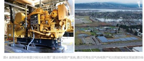 生活污水的處理技術(shù)多種多樣,但目前應(yīng)用廣泛、技術(shù)成熟的處理技術(shù)一般是通過外部添加能源、碳源或藥劑對污染物進行降解,此過程會向外界環(huán)境排放大量溫室氣體,減少額外能量、碳源的輸入,將有助于降低污水廠碳排放。在副產(chǎn)品利用方面,當(dāng)前的工藝技術(shù)中多采用焚燒發(fā)電、厭氧消化產(chǎn)出甲烷、生物產(chǎn)氫等途徑,對污水處理過程中其副產(chǎn)物污泥進行能源轉(zhuǎn)化。例如,日本部分污水廠將熱能用于供暖及融雪工程;德國卡地茨污水處理廠綜合利用太陽能發(fā)電、廢水發(fā)電、熱能發(fā)電、沼氣發(fā)電4種發(fā)電方式解決廠區(qū)自身電能需求;青島光威污水處理廠、六圩污水處理廠利用沼氣發(fā)電技術(shù)減少外部輸入電能。Schaubroeck等與Besson等將生命周期評估法應(yīng)用于奧地利Strass污水處理廠的工藝研究,表明污泥消化產(chǎn)生的沼氣等可生產(chǎn)充足電力并對外輸出并網(wǎng),獲取一定經(jīng)濟利益。圖4展示了美國格雷沙姆污水處理廠通過工藝優(yōu)化提高沼氣產(chǎn)量,使用燃?xì)獍l(fā)電機組將可再生沼氣熱電聯(lián)產(chǎn)與太陽能發(fā)電協(xié)同利用,實現(xiàn)能源凈零,厭氧發(fā)酵池的副產(chǎn)品仍可作為肥料回用于農(nóng)田。
