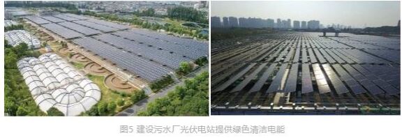 國內(nèi)污水廠的耗電量普遍達0.29 kW·h/m3,相較于美國的污水廠耗電量(0.2 kW·h/m3)而言,該數(shù)據(jù)顯然遠(yuǎn)超發(fā)達國家。通過工藝改進,在降低單位廢水處理耗電量的同時,減少的單位電耗碳排放量將有助于降低廠區(qū)整體碳排放量。污水廠占地較大、樓層較低,采用太陽能、風(fēng)能等新能源將有助于減少廠區(qū)所用市電需求量(圖5),Goswami等研究了在污水處理系統(tǒng)中開發(fā)浮動太陽能光伏(FSPV)系統(tǒng),將光伏組件漂浮在水面上實現(xiàn)太陽能發(fā)電,15 MW太陽能光伏系統(tǒng)可向電網(wǎng)供能26 465.7 MW·h/年,減少蒸發(fā)788萬m3的水,減少CO2排放量近52萬t,有助于污水廠向可持續(xù)發(fā)展轉(zhuǎn)型。劉玉濤等對山東某地下污水廠開展實例分析,論證了通過建設(shè)包含光伏發(fā)電、沼氣發(fā)電等在內(nèi)的多能互補綜合能源系統(tǒng),可實現(xiàn)污水廠的穩(wěn)定供電,每年可節(jié)約標(biāo)準(zhǔn)煤2 855 t,減排CO2以及其他大氣污染物排放7 699 t。