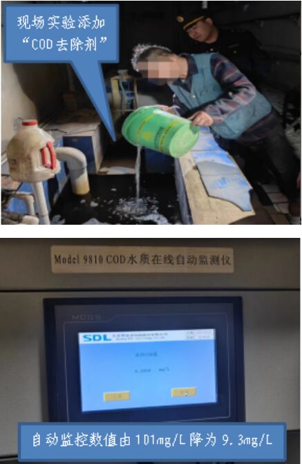 2023年3月29日下午,執(zhí)法人員對(duì)該單位進(jìn)行現(xiàn)場突擊檢查。現(xiàn)場檢查發(fā)現(xiàn),該單位總排口COD自動(dòng)監(jiān)控?cái)?shù)據(jù)上升至100mg/L左右,與平時(shí)的數(shù)據(jù)反差極大。執(zhí)法人員通過全面排查該單位的自動(dòng)監(jiān)控設(shè)施,未發(fā)現(xiàn)設(shè)施有異常情況,在排除采樣環(huán)節(jié)稀釋樣品、分析環(huán)節(jié)修改參數(shù)等常見的造假可能后,執(zhí)法人員現(xiàn)場對(duì)該單位使用的藥劑進(jìn)行逐一排查,發(fā)現(xiàn)部分藥劑未標(biāo)明成分,十分可疑。經(jīng)進(jìn)一步調(diào)查,該單位操作人員最終承認(rèn),平時(shí)為防止COD自動(dòng)監(jiān)控?cái)?shù)據(jù)超標(biāo),在總排口處添加了“COD去除劑”,執(zhí)法人員現(xiàn)場檢查時(shí)未敢添加,導(dǎo)致自動(dòng)監(jiān)控?cái)?shù)據(jù)反彈至真實(shí)水平。該操作人員隨后現(xiàn)場演示了添加藥劑的過程,在此期間COD自動(dòng)監(jiān)控?cái)?shù)值由101mg/L降為9.3mg/L。經(jīng)專業(yè)機(jī)構(gòu)鑒定,該藥劑為濃度超過99%的氯酸鈉,生態(tài)環(huán)境部門將此案件信息通報(bào)公安機(jī)關(guān)后,公安機(jī)關(guān)立即對(duì)“COD去除劑”銷售鏈上下游開展追查,已鎖定上游賣家2家。