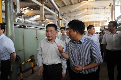 紹興市委書記錢建民(左一)在企業(yè)調(diào)研環(huán)保工作。   ◆徐晶錦   [原因]能源結(jié)構(gòu)不合理、城市揚塵污染問題突出、機動車污染日益嚴重、餐飲油煙問題突出、秸