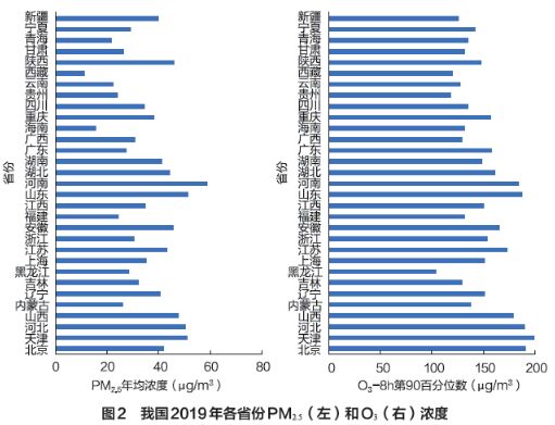 由于我國(guó)幅員遼闊,不同地區(qū)的地形、氣象、污染物排放等方面情況差異很大,造成區(qū)域間和城市間大氣環(huán)境質(zhì)量的巨大不同。對(duì)于PM2.5和O3這兩種對(duì)我國(guó)空氣質(zhì)量影響最大的污染物,污染最嚴(yán)重的地區(qū)都集中于北至華北平原、南至長(zhǎng)江流域、西至關(guān)中平原、東至黃海之濱的區(qū)域(圖2)。我國(guó)目前的大氣污染防治重點(diǎn)區(qū)域,包括京津冀及周邊地區(qū)、長(zhǎng)三角區(qū)域和汾渭平原區(qū)域,以及處于其間的蘇皖魯豫地區(qū),都處于其中,應(yīng)當(dāng)作為我國(guó)大氣污染防治的重點(diǎn)地區(qū)。
