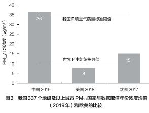 1.3 與發(fā)達(dá)國(guó)家的差距 國(guó)際社會(huì)在大氣環(huán)境管理中也往往將PM2.5和O3作為關(guān)注的重點(diǎn)。經(jīng)過(guò)多年努力,我國(guó)PM2.5濃度雖然大幅降低,但是與發(fā)達(dá)國(guó)家相比,差距仍然明顯。2019年我國(guó)環(huán)境空氣中PM2.5濃度大致是歐美當(dāng)前水平的2.5~4.5倍,是世界衛(wèi)生組織基于健康影響的準(zhǔn)則值的3.6倍(圖3)。O3濃度水平比美國(guó)高30%左右,大致相當(dāng)于美國(guó)20世紀(jì)80~90年代水平,是世界衛(wèi)生組織基于健康影響的準(zhǔn)則值的1.5倍。因此,我國(guó)PM2.5和O3的污染防治和保護(hù)人體健康的需求差距依然巨大,在相當(dāng)長(zhǎng)的時(shí)間里,我國(guó)還需要致力于削減相關(guān)污染物的排放量,持續(xù)大幅度降低PM2.5濃度,盡快遏止O3濃度上升勢(shì)頭并推動(dòng)其濃度下降,保護(hù)人民群眾身體健康。
