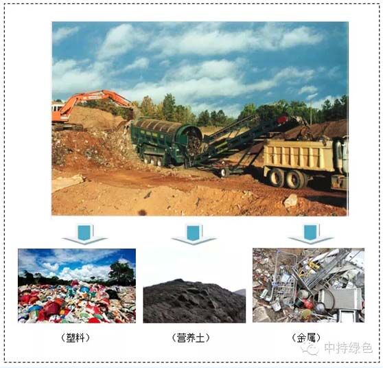 陳腐垃圾開挖篩分,是利用滾筒篩、磁選機(jī)、圓盤篩、風(fēng)選等設(shè)備對(duì)挖出的陳腐垃圾進(jìn)行篩分處理,分選出的各種不同物料進(jìn)行資源化再利用的過(guò)程。穩(wěn)定后的填埋場(chǎng),可進(jìn)行土地再利用。穩(wěn)定后的垃圾可回收金屬、塑料、玻璃等物質(zhì),腐殖土用于園林綠化,砂石等物質(zhì)回填或作建筑材料。