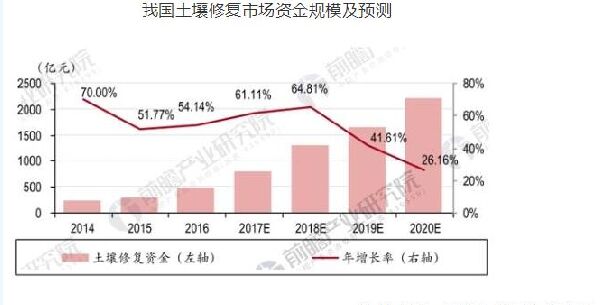 2016年5月“土十條”發(fā)布啟動了土壤污染治理市場,對污染地塊和耕地安全利用率提出了目標。2017年6月,《土壤污染防治法(草案)》提交人大常委會一審,并公開征求社會意見,土壤污染防治立法提速,進入程序后期,有望在17年底18年初出臺。第二次全國污染源普查已于2016年四季度啟動前期準備,將在2018年開展全面普查,有利于揭示我國土壤實際污染水平與投資治理空間。 與此同時,《污染地塊土壤環(huán)境管理辦法(試行)》、《土壤污染防治專項資金管理辦法》已出臺,《農(nóng)用地土壤環(huán)境管理辦法》、《農(nóng)用地土壤環(huán)境質(zhì)量標準》、《建設(shè)用地土壤污染風險篩選指導值》、《土壤環(huán)境質(zhì)量評價技術(shù)規(guī)范》正在征求意見修訂,基本完成土壤污染防治的政策法規(guī)體系構(gòu)建,為土壤污染治理工程的大規(guī)模開展奠定政策基礎(chǔ)。 土十條頒布后市場將保持較高速度增長,據(jù)前瞻產(chǎn)業(yè)研究院發(fā)布的《土壤修復行業(yè)市場前瞻與投資戰(zhàn)略規(guī)劃分析報告》數(shù)據(jù)顯示,2015年產(chǎn)業(yè)規(guī)模只有30億元,2016年增長至90億元,2017年土壤修復產(chǎn)業(yè)規(guī)模達到約合240億元,千億市場前景可期,預計到2020年市場規(guī)?蛇_到2000億,年均復合增長率達到49%。