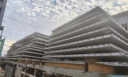運(yùn)輸車上裝載著預(yù)制建筑構(gòu)件