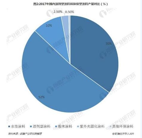環(huán)保涂料現(xiàn)狀:產(chǎn)量不足50% 環(huán)保型涂料包括水性涂料、粉末涂料、無(wú)溶劑涂料、光固化涂料和高固體份涂料等,水性涂料以水作為分散劑,有時(shí)需要10%左右的有機(jī)溶劑輔助溶解和分散,粉末涂料則幾乎是100%固含量,水性和粉末涂料是目前環(huán)保型涂料的主流品種。 據(jù)統(tǒng)計(jì),2017年歐美等發(fā)達(dá)國(guó)家溶劑型涂料產(chǎn)量平均占比不到40%,美國(guó)則不到 30%,德國(guó)僅20%左右,而國(guó)內(nèi)溶劑型涂料占比達(dá)到52%,水性和粉末涂料占比分別約 35%和10%,光固化和無(wú)溶劑等環(huán)保型涂料占比約 3%,環(huán)保型涂料合計(jì)不足50%。