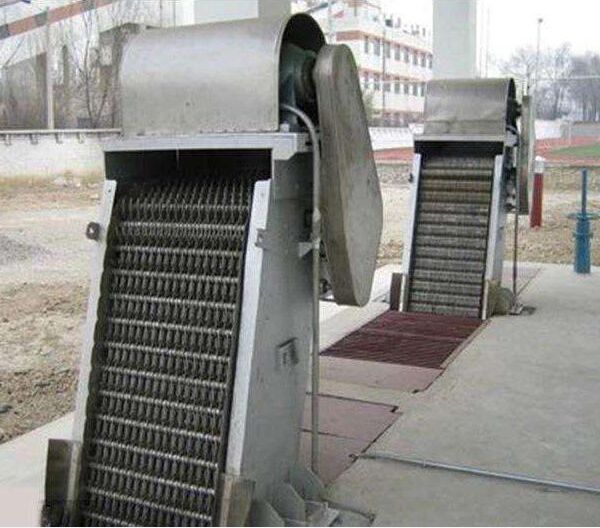 耙齒鏈運(yùn)轉(zhuǎn)到設(shè)備的上部時(shí),由于槽輪和彎軌的導(dǎo)向,使每組耙齒 之間產(chǎn)生相對(duì)自清運(yùn)動(dòng),絕大部分固體物質(zhì)靠重力落下。另一部分則依靠清掃器的反向運(yùn)動(dòng)把粘在耙齒上的雜物清掃干凈。